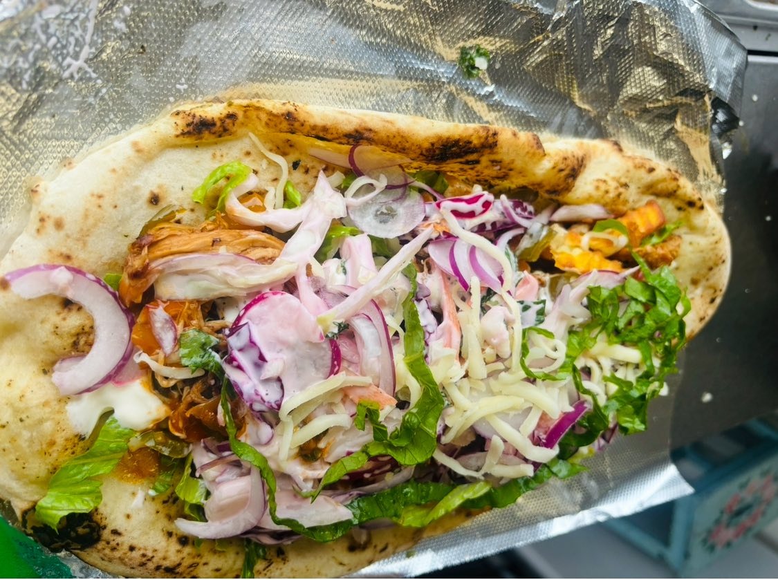 Bowl includes rice, beans, roasted new and sweet potatoes with garlic and herbs, lettuce, jalapeños, pico de gallo, cheese and homemade slaw.